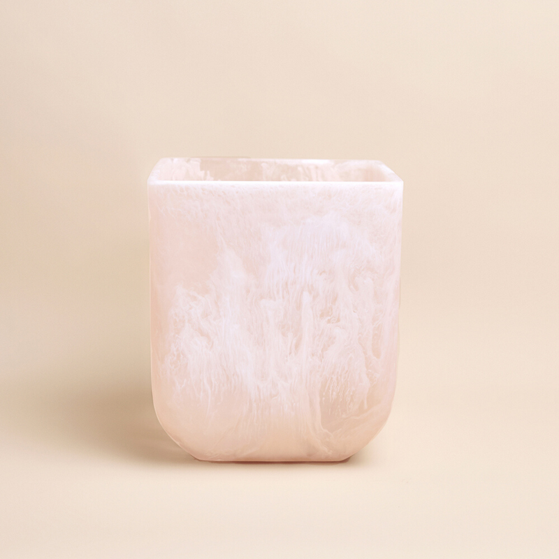 The Flow Resin Bathroom Bin / Planter in Peach Blush is distinctive and organic with its curved lines and marble finish. Each piece is handmade and no two patterns are the same.
