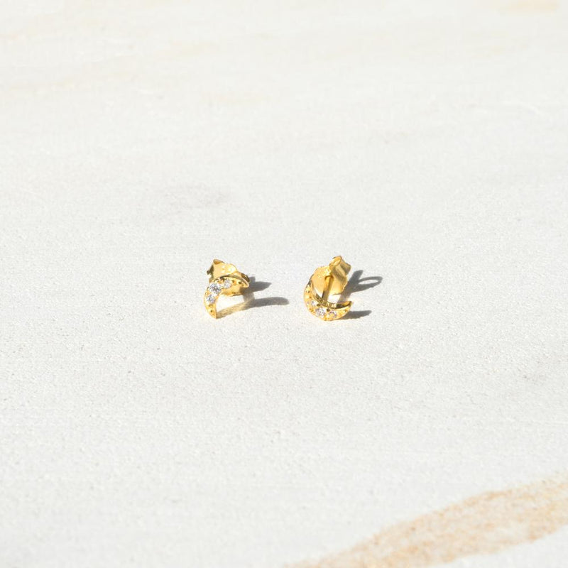 The most dainty little moon studs with cubic zirconia stones. The perfect size to stack up your ear, these moon studs will be sure to sass up your stud game. Tarnish resistant and safe for sensitive skin.