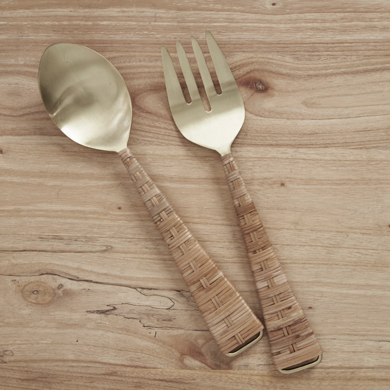 Handcrafted salad servers made in India. The serving ware is made from stainless steel with brass plating and woven rattan around their handles. These unique, beautiful pieces are perfect for serving with style. They are hand-wash only, given the care they deserve they will last forever.
