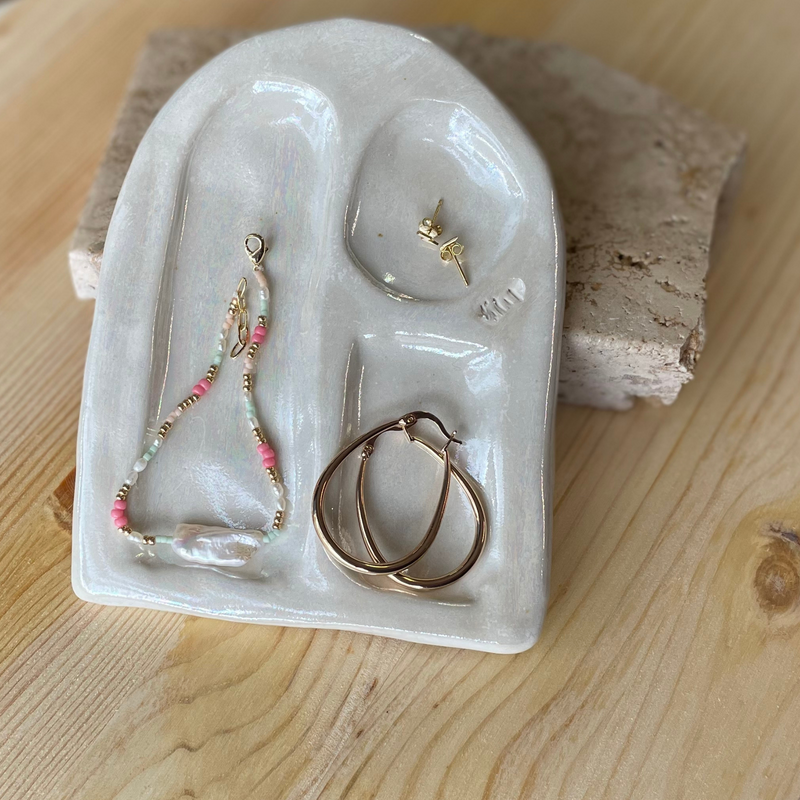 White ceramic trinket / jewellery plate with a white ephemeral mother-of-pearl detailing.